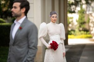 Acompanhando a estação, o vestido ainda contou com mangas longas que conversam diretamente com o corset, responsável pela estruturação da peça e por um design luxuoso. O resultado foi uma peça elegante e atemporal que apresenta um olhar moderno enquanto resgata em detalhes o vintage. Para finalizar a composição, a noiva teve sua beleza em estilo clássico assinada por Alex Cardoso, sapatos da Zimmerman e brincos da avó de Eduardo, seguindo a tradição familiar do noivo.