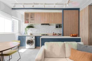 O escritório desenhou toda a marcenaria do apartamento, criando um layout do zero. “Criamos um esquema de porta-painel na cozinha e lavanderia, para isolar esses ambientes quando a cliente sentir necessidade” explica Mariana.