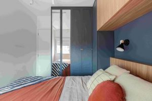 Já para a suíte e banheiro, que está isolada com uma porta de correr embutida, o Studio Moby Dick desenhou todos os móveis e fizeram uma nova pintura seguindo a paleta de cores do projeto. O espaço seguiu a mesma paleta de cores do projeto e foi preciso otimizar todos os espaços para criar um armazenamento funcional que atendesse o cliente. O espelho na porta do armário, amplia o espaço e ainda economiza espaço nas paredes.