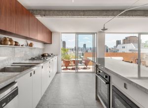 Assinada pelo Studio Olo, a cobertura destaca a integração e fluidez dos espaços, bem como a iluminação natural, com amplas portas de vidro que dão acesso a varanda.
