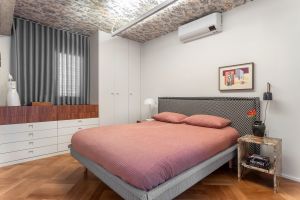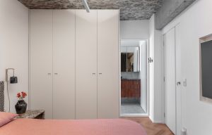 A suíte do casal segue a mesma composição de tons, com a prevalência do branco e detalhes em madeirado. Os roupeiros em Laca Alpes também têm o padrão de puxador inspirado no Loft Celmar na CASACOR 2023. A cômoda branca ganha o topo em Pau-Ferro com corrediças ocultas e amortecedores, destacando o acolhimento para ambiente pensado para conforto e descanso.