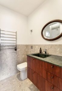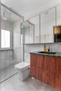 Os banheiros trazem a beleza natural da madeira com MDP Pau-ferro no tamponamento da espelheira e portas dos gabinetes.