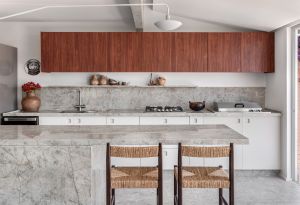 A cozinha privilegia a leveza estética com mobiliário em tons claros e madeirado. O gabinete com portas em Laca Raridades ganhou puxadores com usinagem especial inspirados no espaço proprietário Celmar na CASACOR 2023. Já os armários suspensos trazem as portas em MDP Pau-Ferro e iluminação LED no backsplash. Ao fundo, do lado direito, a porta do lavabo com sistema de correr e puxador tipo Morumbi do piso a teto tem corrediças ocultas com amortecedor, mantendo a proposta clean do espaço.