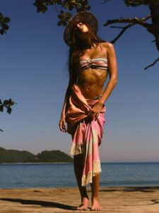 Para finalizar, não poderia deixar de falar das cangas. Elas são itens indispensáveis na mala de viagem de verão, sendo super uteis na praia, além de poderem ser usadas como saias ou vestidos, basta variar o tipo de amarração. Minha dica é selecionar aquelas com estampas que combinam com os maiôs e biquínis, ajudando a construir um visual com atitude e personalidade!