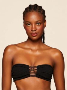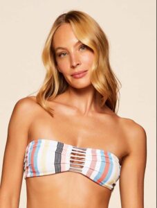 Os tops com tiras, também conhecidos como bandeau, são uma escolha moderna e prática e podem ser utilizados para montar looks que são a cara do verão. O modelo em faixa proporciona sustentação e pode ser facilmente combinado com shorts ou saias fluídas para um visual mais cool.
