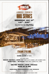 O BBQ Series acontece na próxima quarta-feira, 24 de julho, no Restaurante W South Beach (RWSB), localizado dentro do icônico hotel homônimo. Nesta edição a inspiração são os churrascos italianos. E quem assina o menu é o chef Mario Alegre que recebe como convidados os chefs Michael Beltran e Justin Flit, do restaurante Navé, e também Niven Patel e Tim Piazza, do Erba.