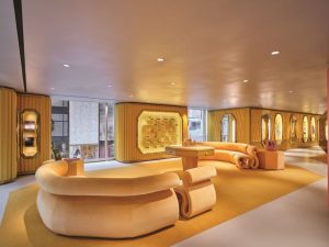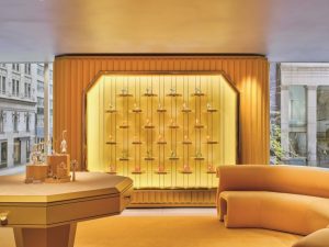No centro do andar térreo, uma grande escadaria rosa em forma de octógono leva os clientes ao andar superior. É emoldurado por oito vitrines octogonais contendo quadros encantadores que retratam episódios dos 128 anos de história da marca austríaca – desde o seu nascimento nos Alpes tiroleses e os primórdios da alta costura até os dias atuais, trazendo um fascínio glamoroso ao cenário do Oscar e ao tapete vermelho do Met Gala de Nova York.
