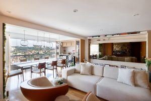 Apartamento de 110 m² conta com escritório/quarto integrado com a sala em projeto assinado pelo Leburma Arquitetura