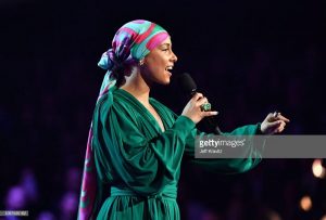 Alicia Keys usa lenço Emilio Pucci para apresentar o Grammy Awards