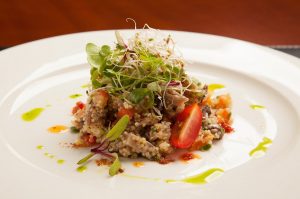 Salada de quinoa com legumes, uva passa e castanha de caju