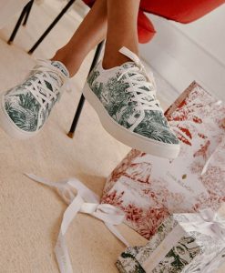 Com três cores diferentes (verde, azul e vermelho), a seleção permite que os produtos sejam combinados entre si. No tableware, por exemplo, os kits de pratos rasos, pratos de sobremesa, bowls, xícara de chá e vasinhos chegam às lojas em trios. Acompanham ainda opções de acessórios como o guardanapo, a bandeja e um conjunto completo com seis xícaras de café. Já no footwear, as criações são sempre embaladas em saquinhos com o mesmo desenho.