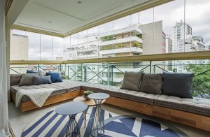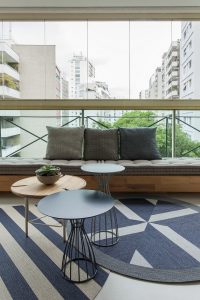 Nesse projeto assinado da arquiteta Karina Korn, a proposta foi de uma varanda de descanso da família. Os tapetes, com formas e estampas geométricas, enaltecem a energia e equilíbrio para o ambiente | Foto: Eduardo Pozella
