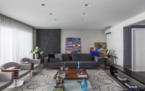 Abaixo, selecionamos quatro lindas salas projetadas por Karina Korn que recebem tapetes estampados. Confira: