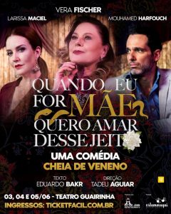 Nos dias 3, 4 e 5 de junho, o Teatro Guairinha recebe “Quando eu for mãe quero amar deste jeito”, pela escrita por Eduardo Bakr com direção de Tadeu Aguiar. O espetáculo marca o retorno de Vera Fischer ao palco depois de 4 anos. Ao mesmo tempo completa 55 anos de carreira. No elenco ainda estão Larissa Maciel e Mouhamed Harfouch.