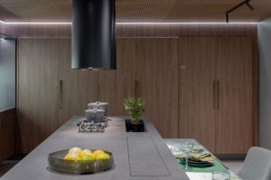 A cozinha também traz outros itens inovadores, como um cooktop instalado diretamente sobre a bancada, eliminando a base de vidro ou inox do cooktop tradicional, e embutindo os queimadores diretamente sobre a bancada em porcelanato. Outra novidade é a utilização do corian na mesa e na pia. É um material versátil, com acabamento mais minimalista.