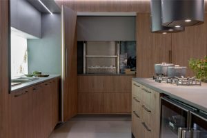 Com inspiração em exposições na Europa, os arquitetos trouxeram uma proposta arrojada, que também inclui eletrodomésticos de última geração e dois ambientes ‘escondidos’: a geladeira e a área para churrasqueira, ambos instalados atrás de um armário. “A cozinha gourmet é um espaço criado para receber as pessoas, com ousadia, tecnologia e sofisticação. Quisemos trazer para o projeto as tendências de decoração que temos visto em feiras internacionais”, explica o arquiteto Nelson Machado.