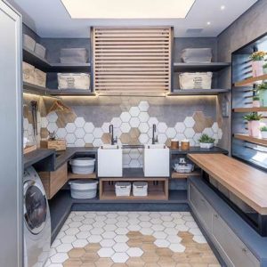 Para criar esta lavanderia de encher os olhos, a dupla Pedro de Godoy Martarello e Giovanna Carvalho apostaram na mescla de porcelanatos hexagonais das coleções Giardino, que reproduz a cor e a textura da madeira do carvalho, e Rima, que traz um conjunto de peças, em diferentes tons, que podem ser combinadas entre si – nesse projeto a escolha foi pela peça branca, criando, assim uma atmosfera moderna e sofisticada.