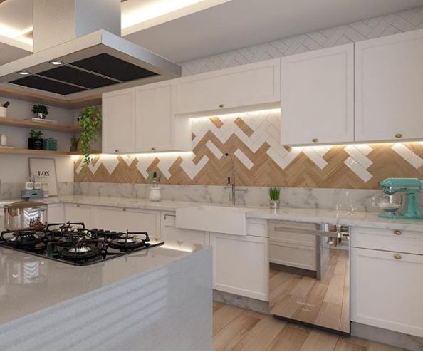 A arquiteta Marilia Zimmermann deu atenção especial a essa cozinha utilizando os revestimentos da coleção Brick de uma maneira inusitada. O mix entre os tons brancos e as peças amadeiradas deixaram o ambiente suave e aconchegante.