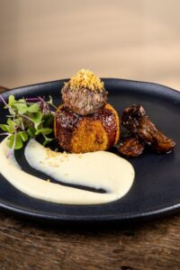 Prato Principal: Duo de cordeiro com musseline de queijo coalho, chutney de caju e demi-glace de hortelã.