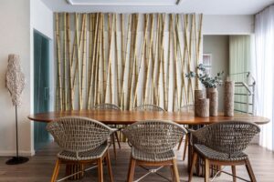 O projeto, feito para a ContTi Home Design, combina elementos que dialogam com dois universos: a arquitetura costeira mediterrânea, com seus arcos e materiais crus, e a brasilidade traduzida em gestos orgânicos, vegetação exuberante e no uso acolhedor das cores. O espaço se estrutura como um pátio contemporâneo. No fundo, três arcos revestidos em pedra natural dão profundidade e textura. No teto, o forro de bambu cria um desenho de linhas e sombras que se move com a luz do dia.