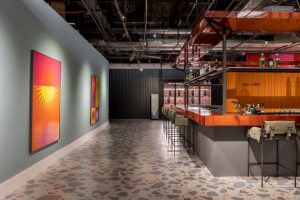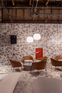 Para revestir o chão e uma das paredes, a arquiteta especificou o porcelanato Flakes MIX NAT da Ceusa, com aparência de granilite estilizado, garantiu mais um toque de cor ao ambiente, dessa vez com tonalidades mais neutras, como cinza e areia. A versatilidade do produto possibilitou que Luciana trouxesse ao ambiente uma parede revestida com o porcelanato. As peças, com formato de 120x120cm, harmonizaram com o colorido do projeto, proporcionando aos visitantes uma experiência surpreendente.