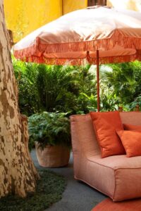 O ambiente traz a linha completa Boho, com destaque para as poltronas giratórias, sofás generosos, pufes com franjas, mesas em corda náutica e pedra Quebec e os icônicos ombrelones Goa, que nesta versão aparecem também com franjas. Cada peça reforça a ideia de movimento, fluidez e liberdade, ao mesmo tempo em que oferece aconchego, beleza e versatilidade. Além dos móveis, a composição é enriquecida por materiais naturais e contrastes sensoriais: veludos, madeira, cerâmicas artesanais, metais escuros e iluminação indireta. A paleta de cores navega entre o verde jade e a cor do ano, mocha mousse, um tom terroso que simboliza aconchego e conexão que chega à Tidelli.