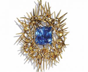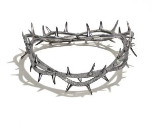 Lamar e Free tinham uma visão e intenção claras para o design da coroa. Além de fazer referência à “Coroa de Espinhos”, os artistas também se inspiraram no icônico broche Thorns de Jean Schlumberger, que o lendário designer criou em 1947, antes de ingressar na Tiffany & Co. em 1956. O broche Thorns, que apresenta projeções de espinhos feitas à mão. O ouro amarelo 18k que circunda uma safira de 47 quilates, está atualmente em exibição na exposição Vision & Virtuosity da Maison em Londres, até 19 de agosto.