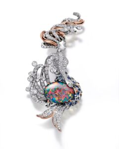 Encantado pela figura mítica da sereia, este capítulo explora seu fascínio através do olhar imaginativo de Nathalie Verdeille. Um broche em platina, ouro rosa e diamantes retrata uma sereia em movimento, acentuada por uma opala negra de mais de 10 quilates em sua cauda. O motivo continua em um expressivo anel, brincos e colar, cada peça um tributo a uma fantasia subaquática.