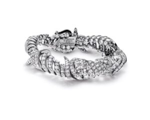 O capítulo Anchor reimagina o broche de rubi, ametista e safira rosa de Jean Schlumberger de 1939, um símbolo de força e simetria. O novo pingente, anel e pulseira — cada um centrado em diamantes cushion-cut — definem a coleção com sua geometria atemporal. O pingente Anchor em platina e ouro 18k apresenta um diamante de mais de 2 quilates; o anel, um diamante de mais de 5 quilates; e a pulseira, um diamante de 1 quilate — todos adornados com acentos de diamante que conferem luminosidade a cada peça.