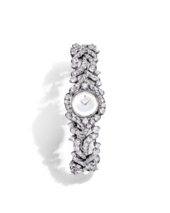 Novo no capítulo Ocean Flora está um relógio de alta joalheria único, com mostrador de madrepérola, marcador de turquesa na posição das 12 horas e uma pulseira de diamantes que ecoa os motivos vistos nas peças deste capítulo.