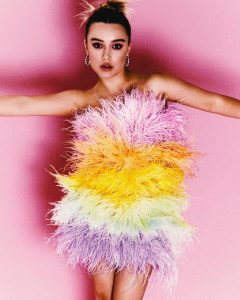 Composta por peças em tons de rosa e lilás, muitas plumas, brilho, transparência e paetê, a coleção traz vestidos, tops, saias e calças statement com um visual que falam por si só. Os destaques ficam por conta do vestido midi de plumas, o conjunto de top e calça metalizados e o vestido de manga comprida de paetê com estampa floral, fenda e acompanhado de pulseiras de plumas removíveis.