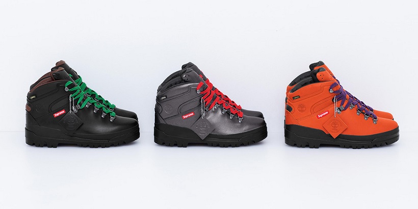 As duas famosas marcas americanas, Timberland e Supreme, decidiram unir forças em uma collab, criando um novo modelo da Front Hiker Country Boot, uma bota com visual de alpinismo mas cheia de estilo, disponível em três cores: preto, prata e laranja. Feita em couro premium impermeável, possui sola de borracha Vibram® e construção selada com a costura. Os cadarços coloridos contrastam com as botas. Os logotipos finalizam os detalhes, presentes no tornozelo e na lateral.