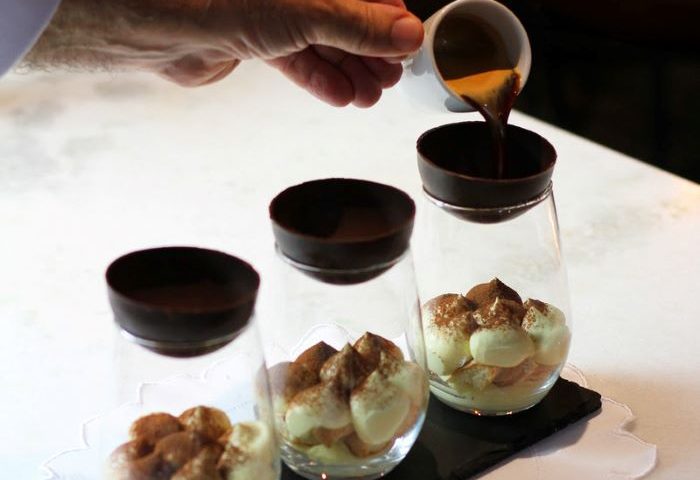 A receita leva Mascarpone, biscoito champagne, chocolate e café e é finalizado na frente do cliente.