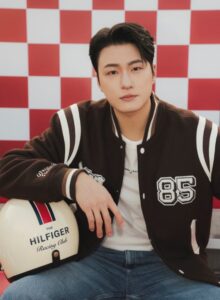 Shin Seung Ho usou uma jaqueta varsity, T-shirt com logo e jeans da coleção Tommy Jeans Outono 2025, combinados com botas Chelsea de couro da coleção Tommy Hilfiger Outono 2025.