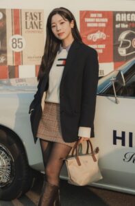 DAHYUN escolheu um blazer alongado de abotoamento simples, suéter bordado com o emblema TH Flag, minissaia de tweed xadrez e botas de montaria, todas peças da coleção Tommy Hilfiger Outono 2025.