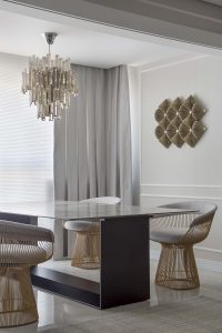 Os profissionais tiverem o cuidado de planejar uma continuidade dessas cores destaque: o dourado, que dá tom ao painel de muxarabi, está presente também nos veios do mármore da lareira, na escultura de dobradura de livros e no lustre da sala de jantar, nas cadeiras Platiner e no papel de parede de cortiça, da StilHaus, que reveste a churrasqueira As pedras naturais ganham destaque com o mármore Calacata Oro, que reveste toda a lareira; e o granito tartaruga, feito sob medida para o tampo da mesa de jantar. Presente em todos os ambientes, as obras de arte, assinadas pelo artista plástico Eleuthério Netto, também agregam novas texturas e composições cromáticas.