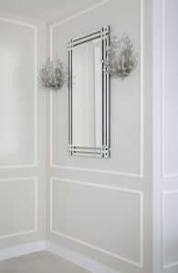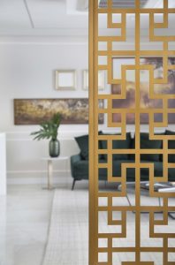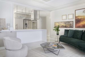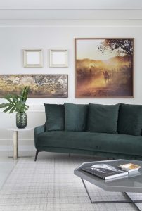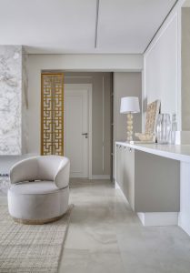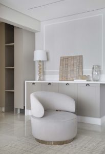 Os detalhes do estilo clássico ficam claros no uso de boiseries, aplicados nas paredes, e no mobiliário planejado em estilo provençal. A cartela de tons neutros, como o cinza e o branco, serve como pano de fundo para pontos de destaque, como sofá de veludo verde, em um contraste de formas e cores.
