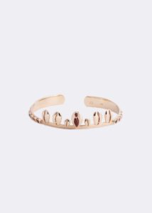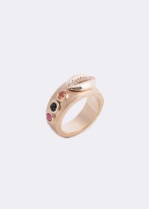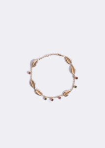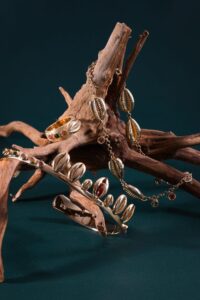 Essa atmosfera única se transformou em joias que capturam a essência desse momento. Topázios imperiais, turmalinas verdes e rosas, jaspe e diamantes refletem as águas cristalinas, o brilho da areia e o frescor da floresta. Búzios evocam a poesia do mar e sua conexão com o tempo. Ao todo são 10 peças entre braceletes, anéis, tornozeleiras e brincos. A coleção é produzida de forma manual, com lapidação primorosa para refletir o ambiente.