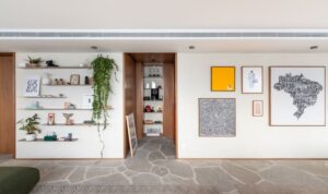 Um imponente hall de entrada recebe os visitantes deste apartamento de 333m², projetado pelo escritório Labra Arquitetos na Vila Madalena, em São Paulo. Logo na chegada, painéis de madeira revestem as paredes e o forro, criando uma atmosfera acolhedora. O espaço é complementado por uma estante e uma porta camarão em serralheria na cor terracota, antecipando a harmonia entre materiais naturais e o design contemporâneo que se desenvolve ao longo do projeto. O lavabo, igualmente elegante, traz uma composição de seixos brancos com bancada de madeira de demolição e uma cuba de pedra natural.