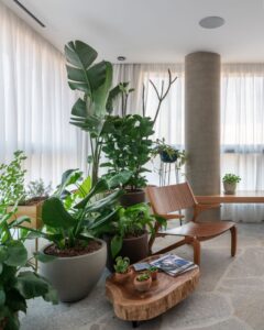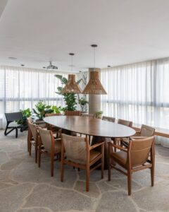 Os clientes solicitaram materiais que refletissem seu estilo despojado e autêntico. O piso de pedra natural, com uma paginação orgânica, domina a área social, enquanto as paredes receberam uma textura suave para complementar o ambiente. Jardins internos, idealizados em parceria com a paisagista Cynthia Matos, foram estrategicamente posicionados, trazendo a natureza para dentro do apartamento e dialogando com o verde presente em peças de mobiliário.