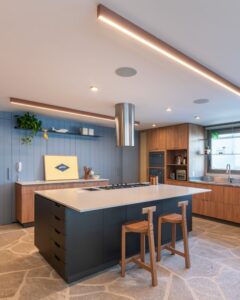 A cozinha original, que era isolada e pequena, foi completamente redesenhada com a realocação da lavanderia para o antigo cômodo anexo a ela, tornando-se um ambiente espaçoso e funcional integrado à área social. Um painel frisado azul, discretamente disfarçado nas portas de acesso à área privativa, garante a fluidez entre os espaços.