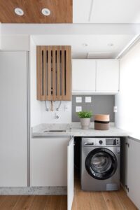 Além disso, o projeto pensou em todos os detalhes, como uma área de serviço organizada e discreta, onde os equipamentos ficam escondidos, garantindo praticidade sem abrir mão do design. O lavabo, com metais dourados e tijolinhos rústicos, finaliza o apartamento, mostrando que até os menores ambientes podem ter grande impacto na decoração e funcionalidade do espaço.