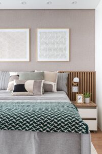 A suíte master foi pensada como um refúgio íntimo e relaxante. A integração com a varanda, através de um jardim vertical, oferece um cantinho especial para relaxamento ou para trabalho. O papel de parede em linho e a cabeceira ripada garantem conforto e sofisticação, ao mesmo tempo em que aproveitam ao máximo a luz natural.