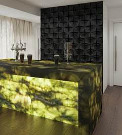 Iluminado, o quartzito Emerald Green (à direita) ganha um aspecto especial. Tanto Emerald Green quanto Mykonos (à esquerda) podem ser aplicados nos mais diversos ambientes