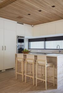 O material é peça chave para a linguagem unificada do projeto – sua paginação garante uma sensação de continuidade entre os ambientes, mesmo nos que estão separados em diferentes pavimentos. O revestimento se repete na sala de estar, área gourmet, banheiros e área externa, além das escadas de acesso. Em um jogo de texturas, os profissio11nais utilizaram variações no acabamento do travertino, ora mais fosco, ora mais polido. “Não é porque o material é clássico que devemos ficar presos em uma forma de usar”, afirma a arquiteta Daniela Frugiuele.