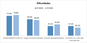 Os empresários elencaram as principais dificuldades para a atividade empresarial, sendo que a mais citada foi a instabilidade econômica, seguida pela carga tributária elevada, clientes descapitalizados e aumento no custo das mercadorias. Os empecilhos mencionados foram praticamente os mesmos relatados no semestre anterior.