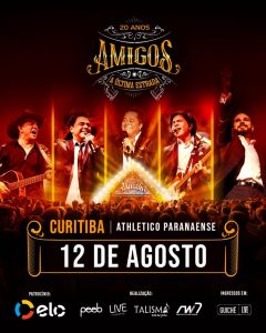 Sucesso de público capaz de matar a saudade de quem testemunhou esse encontro há vinte e poucos anos, mas também de quem nunca havia presenciado a união de Chitãozinho e Xororó,Leonardo, Zezé Di Camargo e Luciano no mesmo palco, “Amigos” ganha novo revival neste ano, com apresentações limitadas. Nessa nova jornada, Curitiba receberá a turnê no dia 12 de agosto, sábado, em uma estrutura jamais vista no Estádio Athletico Paranaense. Na capital paranaense, a produção e realização são da Peeb, LiveTalentos, TalismãMusic e RW7 Production &Entertainment.
