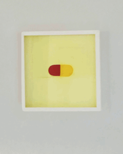A gravura “Pílula”, de Teka Braga Côrtes, ganha destaque na exposição. A obra, que faz uma relação com o tema da saúde, explora a pausa entre dor e alívio, trazendo um impacto visual direto e simbólico. “A cápsula em vermelho e amarelo representa o contraste entre o incômodo e a cura. Tem remédio para tudo, não é mesmo”, explica a artista plástica.