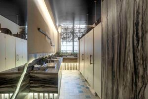 Bruna de Sá e Chico Casarões se inspiraram na Serra da Curral para criar o Curvas do Interior, Texturas do Tempo. O banheiro de uso público tem presença abundante do mármore marrom, com traços nas cores branco e cinza, extraído na região de Barroso/MG, traduzindo por meio de seus veios marcantes, a paisagem e as riquezas do estado. A presença da vegetação aproxima do conceito inicial.
