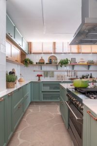 O principal desafio do escritório de arquitetura foi aumentar a cozinha porque, embora o apartamento tenha uma metragem generosa, esta área era muito pequena e separada da copa – que também tinha pouco espaço. A solução foi “roubar” um pedaço da sala para conseguir um cômodo perfeito, do jeito que a família queria e, ainda, com ares de casa de campo. No revestimento foi colocado um porcelanato irregular tanto no piso quanto nas paredes, com formatos orgânicos, resultando num visual bem rústico.